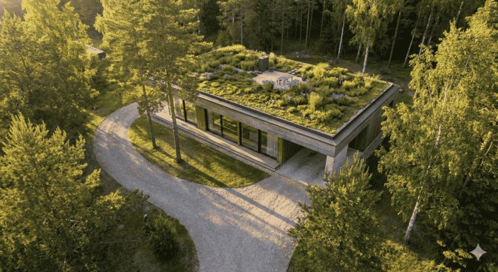 “Genera una vista aérea fotorrealista de una casa moderna con grandes ventanales, techo plano con jardín, rodeada de árboles y con un camino de entrada curvo. La imagen debe mostrar la casa desde un ángulo de 45 grados, con luz matutina que proyecta sombras suaves y definidas. Estilo arquitectura escandinava minimalista.”